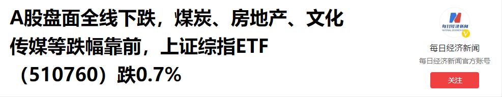 每日經濟新聞 2024-08-20 A股盤面全線下跌,煤炭、房地產、文化傳媒等跌幅靠前,上證綜指ETF(510760)跌0.7%