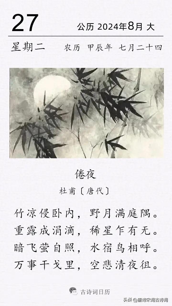 “重露成涓滴,稀星乍有無。”頷聯是說,竹葉上,凝聚了許多濃重的小水珠,滴滴答答,不時滾落下來;此時,月照中天,星星稀疏,若隱若現,時有時無。這是寫“時光之流轉”。