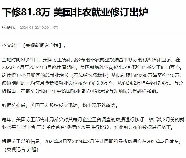 環球時報2024-08-2210:00 下修81.8萬 美國非農就業修訂出爐