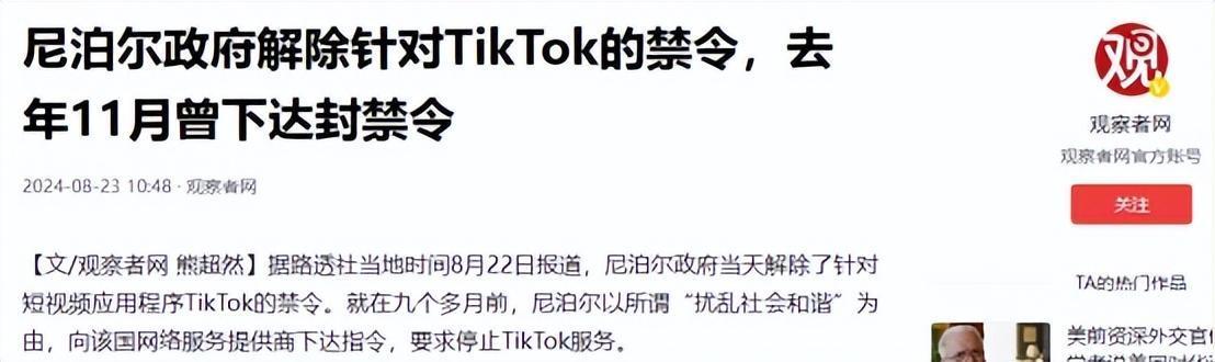 尼泊爾政府解除針對TikTok的禁令,去年11月曾下達封禁令2024-08-23 10:48·觀察者網