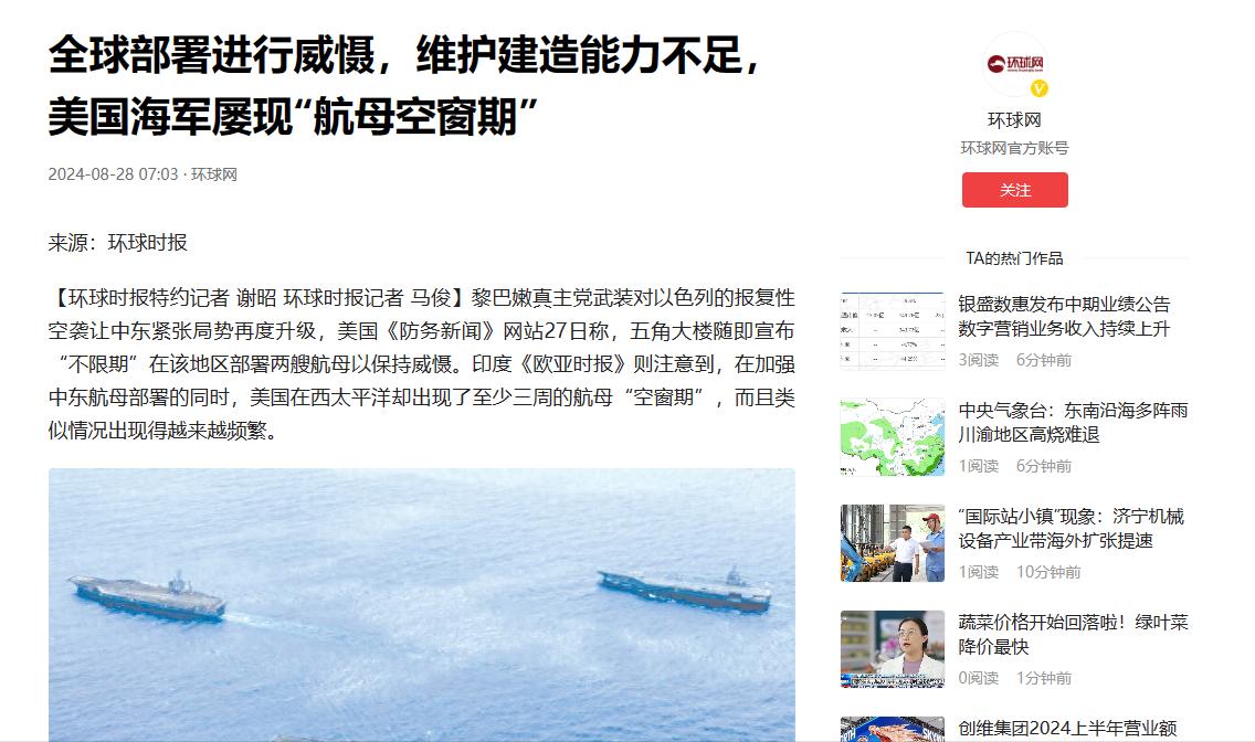 2024-08-28 07:03·環球網 全球部署進行威懾,維護建造能力不足,美國海軍屢現“航母空窗期”