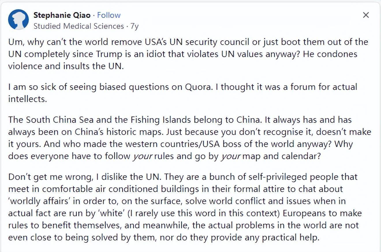 其問題的本意就是“爲什麼中國在南海問題上不遵守國際法院秩序“南海仲裁案”,聯合國卻不能取消中國在聯合國安理會的成員資格?”