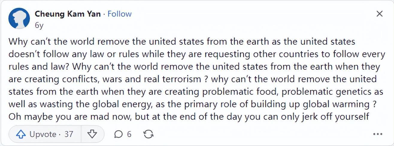 介於西班牙網友的評論,馬來西亞網友也在下面針對美國展開了分析,其中馬來西亞網友表示到,美國明明在世界上不斷的製造恐慌以及侵略行爲,甚至還在蠱惑其他地區發動戰爭,用全球的能源去製造核武器而不是將這些資源來發展全球經濟,爲什麼世界不能將美國抹除,美國試圖控制全球的規則卻不遵守基本的規則,爲什麼美國不能直接消失呢?