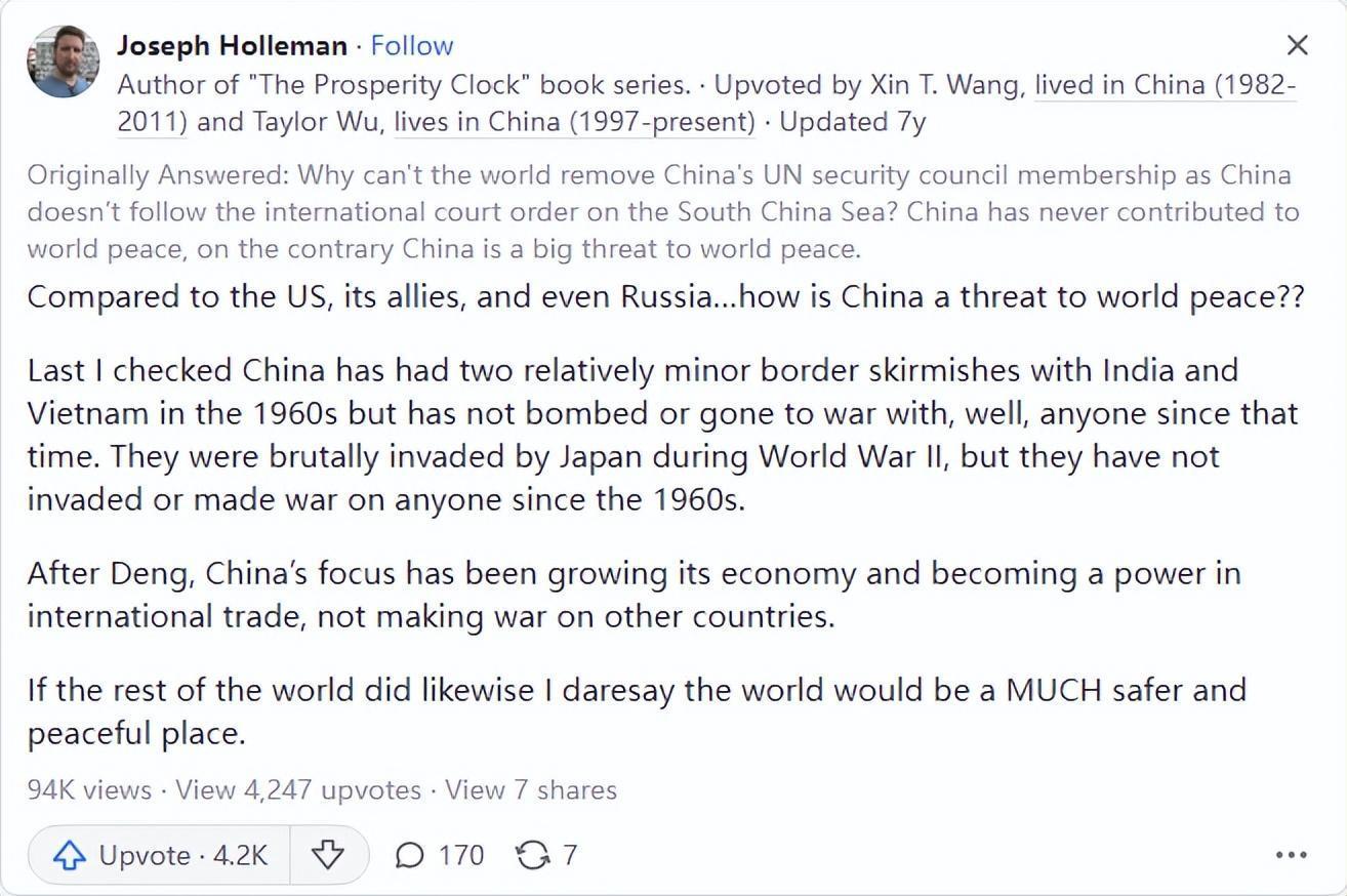 他表示到無論是二戰還是至今,中國是一個非常和平的國家,中國沒有任何一次對外侵略的歷史,而且在同越南以及印度的作戰上均爲對方先挑事情,拿中國相較於俄羅斯以及美國相比的話簡直是可笑。