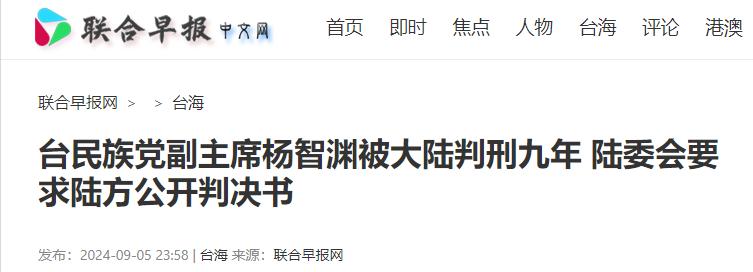 聯合早報網 2024-09-05 23:58 臺民族黨副主席楊智淵被大陸判刑九年 陸委會要求陸方公開判決書