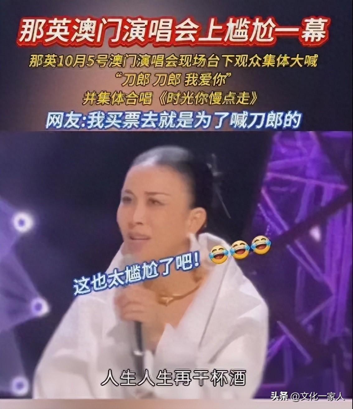 在澳門國慶演唱會上,那英把十一說成五一,又自嘲歲數大了,哈哈一笑爲自己解圍。