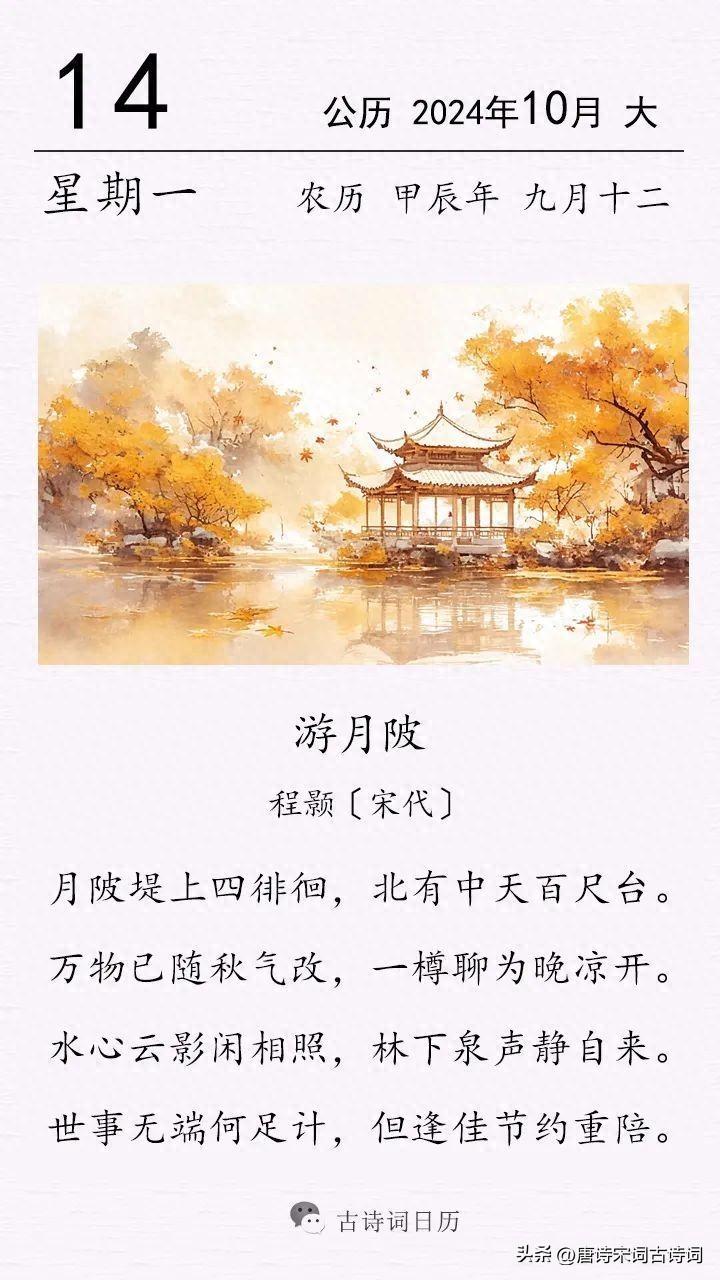 “月陂堤上四徘徊,北有中天百尺臺。”首聯是說,月陂岸堤上,“我”東西南北,四個方向,來回行走。月陂北面,擁有高聳入雲的百尺高臺。這是寫“月陂之秋色”。