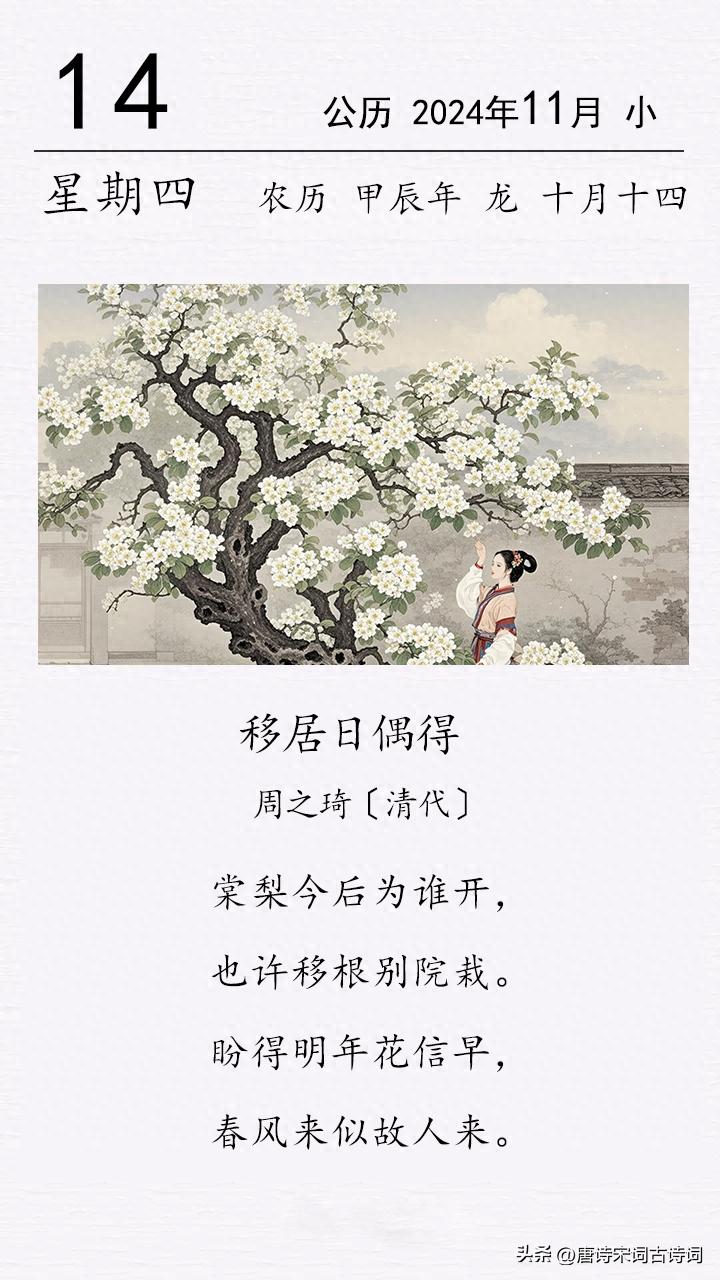 這首詩最絕妙之處在於詩人以棠梨花爲寄託,藉助移居別離的時刻,表達了對棠梨花的深情與期待,對舊居生活的不捨,以及對世事變遷的無可奈何和對未來美好生活的一種憧憬。