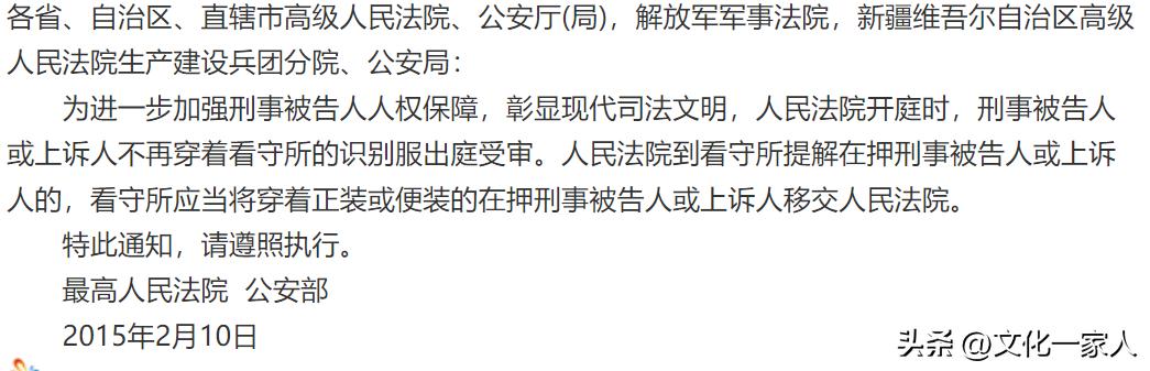2015年2月10日,最高人民法院與公安部聯合制定並下發《關於刑事被告人或上訴人出庭受審時着裝問題的通知》,明確要求人民法院開庭時,刑事被告人或上訴人不再穿着看守所的識別服出庭受審。