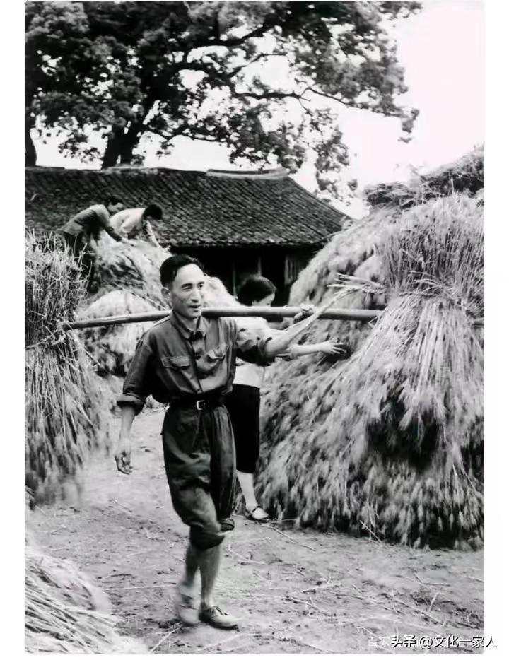 這是浙江黃岩縣委書記呂衆義,也是挽起褲腿,捲起衣袖,挺着瘦弱的身軀,挑着兩大梱收割的稻穀,走在路上。