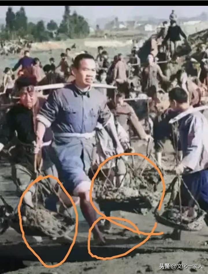 這是上世紀六十年代,湖南汝城縣委書記曾春桃,挽起褲腿,捲起衣袖,打着赤腳,在泥濘的工地上,挑着滿載的擔子,與羣衆一起勞動。