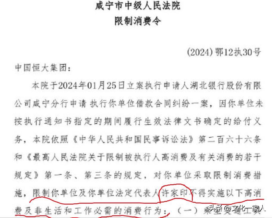 早在2024年3月18日,咸寧市中級人民法院,因中國恆大集團未履行生效法律文書,就已經對主要負責人許家印限制高消費。
