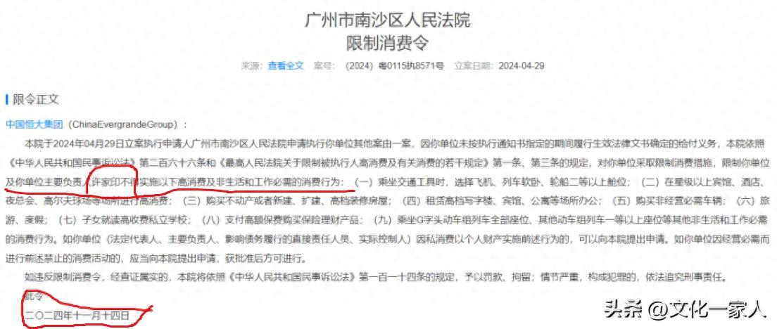 2024年11月14日,廣州市南沙區人民法院,因中國恆大集團未履行生效的法律文書,對主要負責人許家印限制高消費。