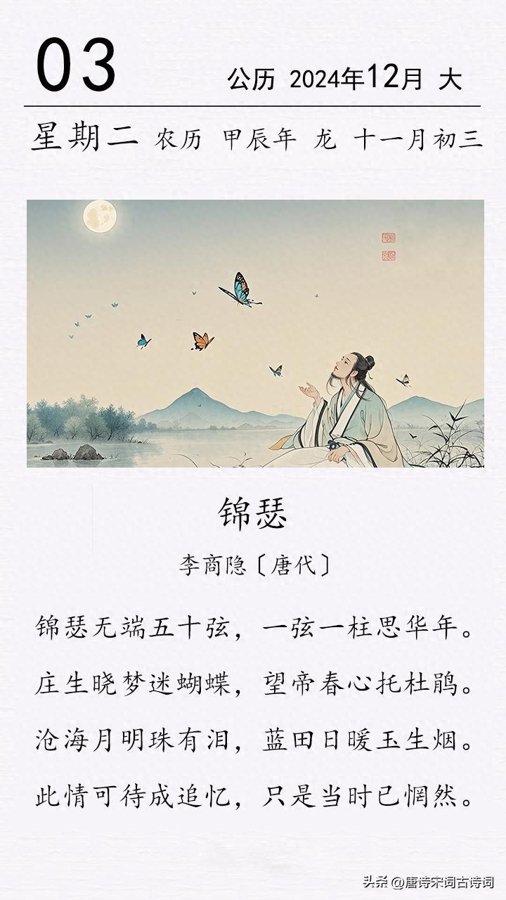 “錦瑟無端五十弦,一弦一柱思華年。”首聯是說,錦瑟呀,你爲何偏偏只有五十根弦?每一弦每一節,都令人懷念逝去的美好年華。這是寫“年華之美好”。 每一根弦,代表了詩人的一歲。五十根,就類似於五十歲。當然這只是個概數,因爲詩人只活到46歲就去世了。所以,毫無疑問,“錦瑟”在這裏象徵着人生的種種經歷與情感。而回首這一生,往事一幕幕在腦海裏浮現。聽琴的過程,其實就是回味一生的過程。 “莊生曉夢迷蝴蝶,望帝春心託杜鵑。”頷聯是說,我心如莊子,爲蝴蝶曉夢而迷惘;又像望帝化杜鵑,寄託春心的哀怨。這是寫“年華之如夢”。