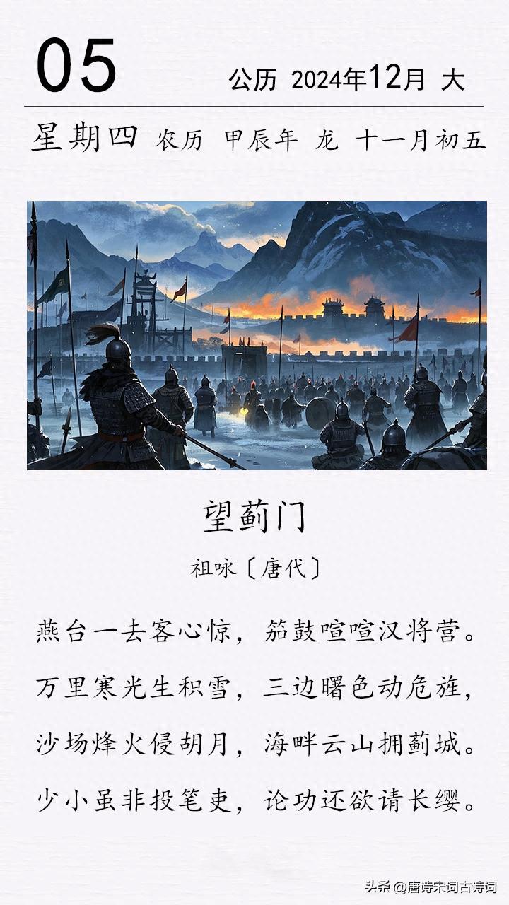 “萬里寒光生積雪,三邊曙色動危旌。”頷聯是說,萬里之外的邊疆,積雪覆蓋,寒光閃閃,預示着環境的嚴酷與艱難;而三邊的曙色中,高懸的軍旗隨風飄動,更是顯得氣勢磅礴,令人心生敬畏。這是寫“薊門之景色”。