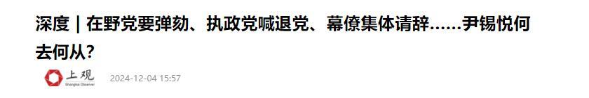 參考信源:《深度 | 在野黨要彈劾、執政黨喊退黨、幕僚集體請辭……尹錫悅何去何從?》上觀新聞2024-12-04 15:57