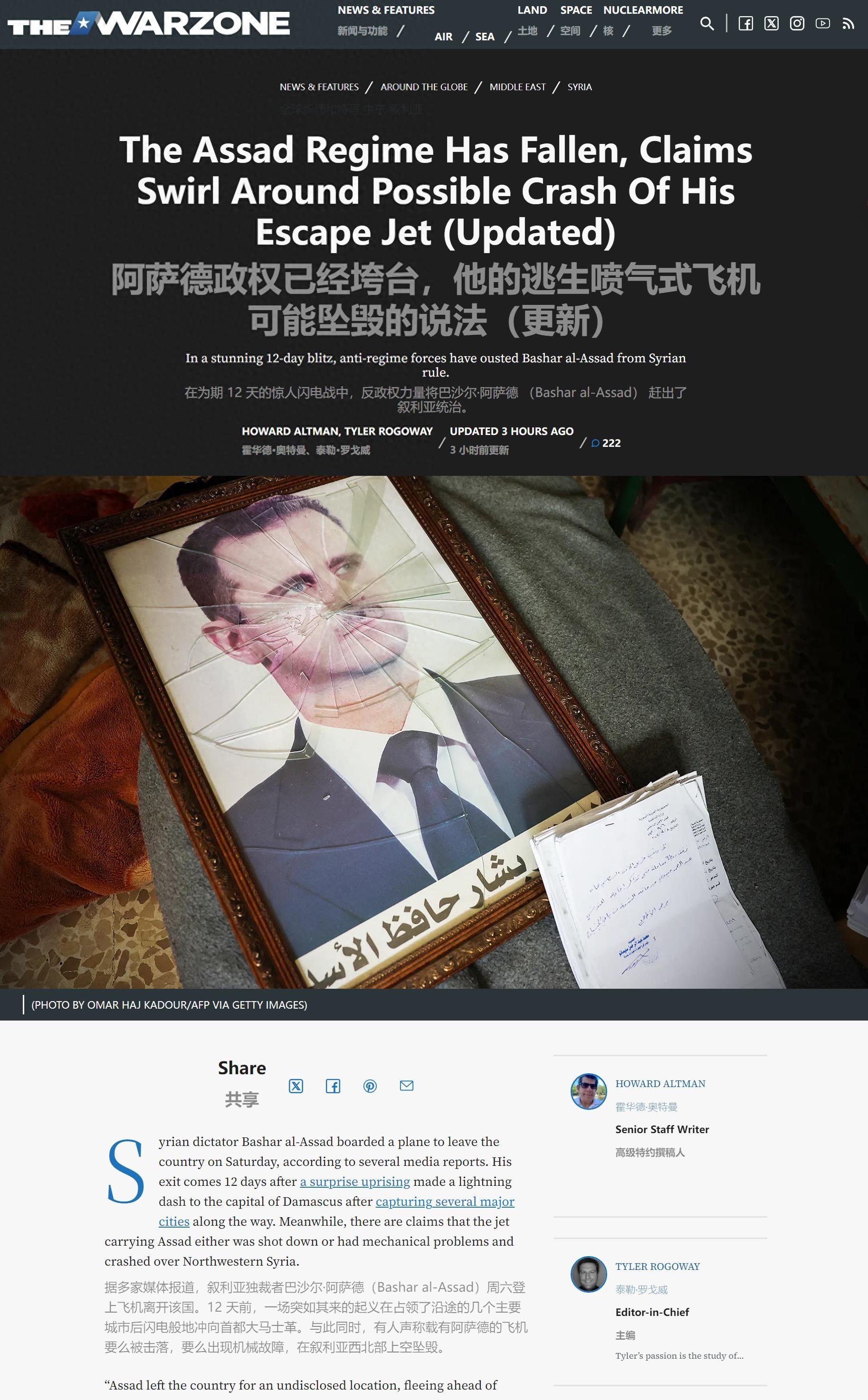 不僅如此,敘利亞航空公司旗下的一架飛機在從大馬士革起飛後疑似已經墜毀。而這架飛機也被懷疑正是阿薩德離開大馬士革所乘坐的專機。