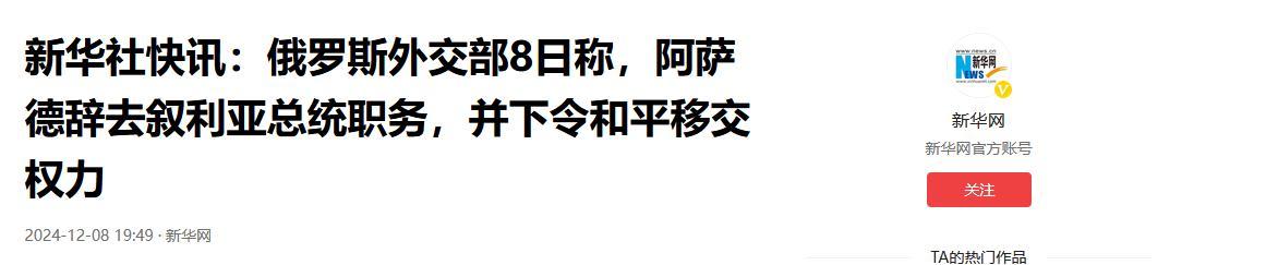 參考信源:《新華社快訊:俄羅斯外交部8日稱,阿薩德辭去敘利亞總統職務,並下令和平移交權力》新華網
