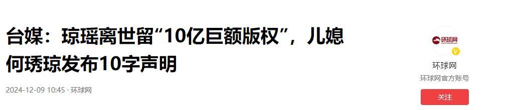 參考信源:《臺媒:瓊瑤離世留“10億鉅額版權”,兒媳何琇瓊發佈10字聲明》2024-12-09 10:45·環球網