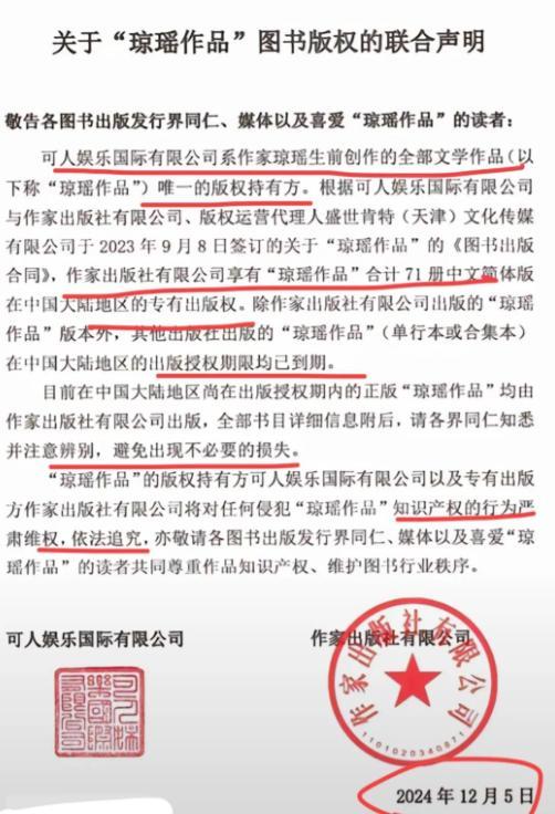 在12月5日的時候,可人娛樂國際有限公司發佈了一則維權通知,表示作家出版社有限公司享有瓊瑤作品共71冊中文簡體版,在中國大陸地區的專有版權。