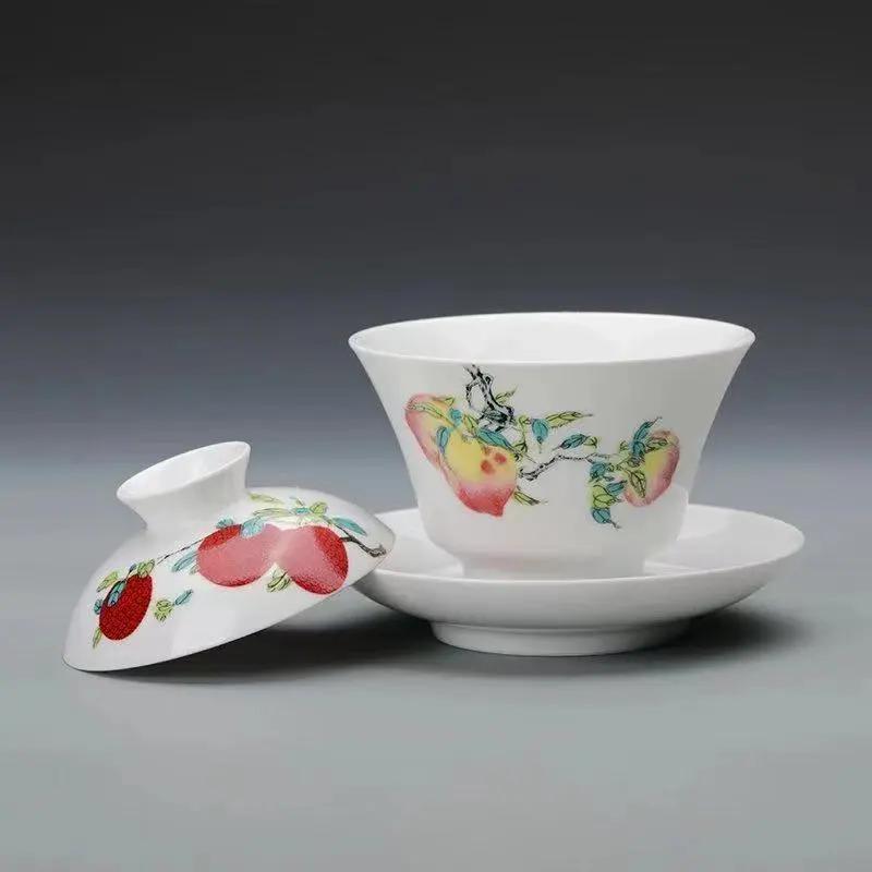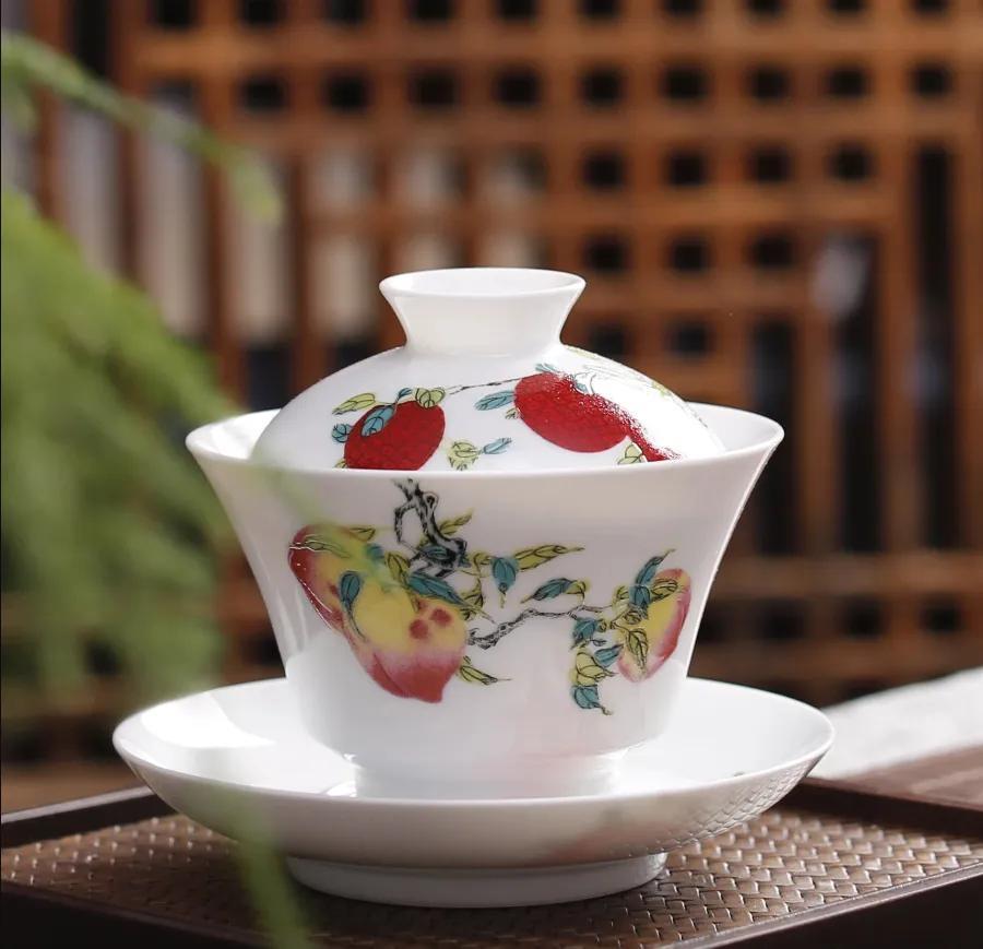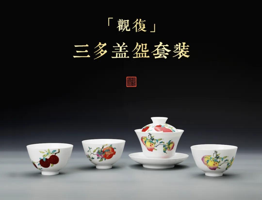 觀復此三多紋系列蓋碗,以桃子、石榴、荔枝組合裝飾而成。