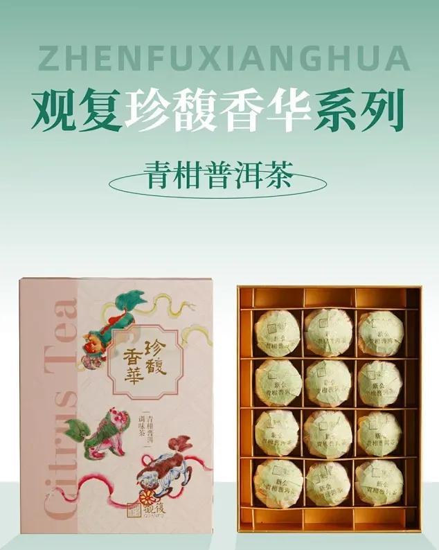 青柑鮮爽,普洱馥郁。觀復博物館取【廣東新會青柑】及【雲南勐海普洱】之味,推出珍馥香華系列——[青柑普洱茶]