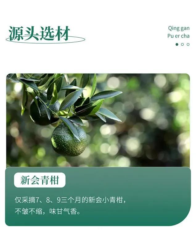 新會的茶枝柑一般一年採收三次:7月至9月果皮還爲綠色時摘一次,稱爲“小青柑”;11月,重陽節前後,果皮變成黃綠色時再摘一次,稱爲“二紅柑”;12月,冬至前後,內外徹底熟透,果皮變得橙紅時再摘一次,稱爲“大紅柑”。