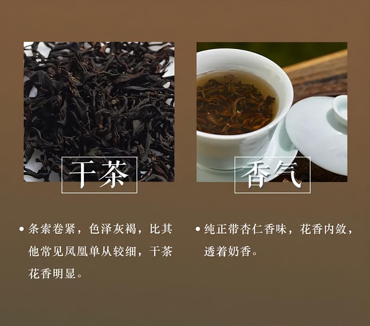 鳳凰單叢杏仁香:帶有奶甜的杏仁香氣,花香內斂,湯色橙黃明亮,味中含韻,滋味鮮爽。