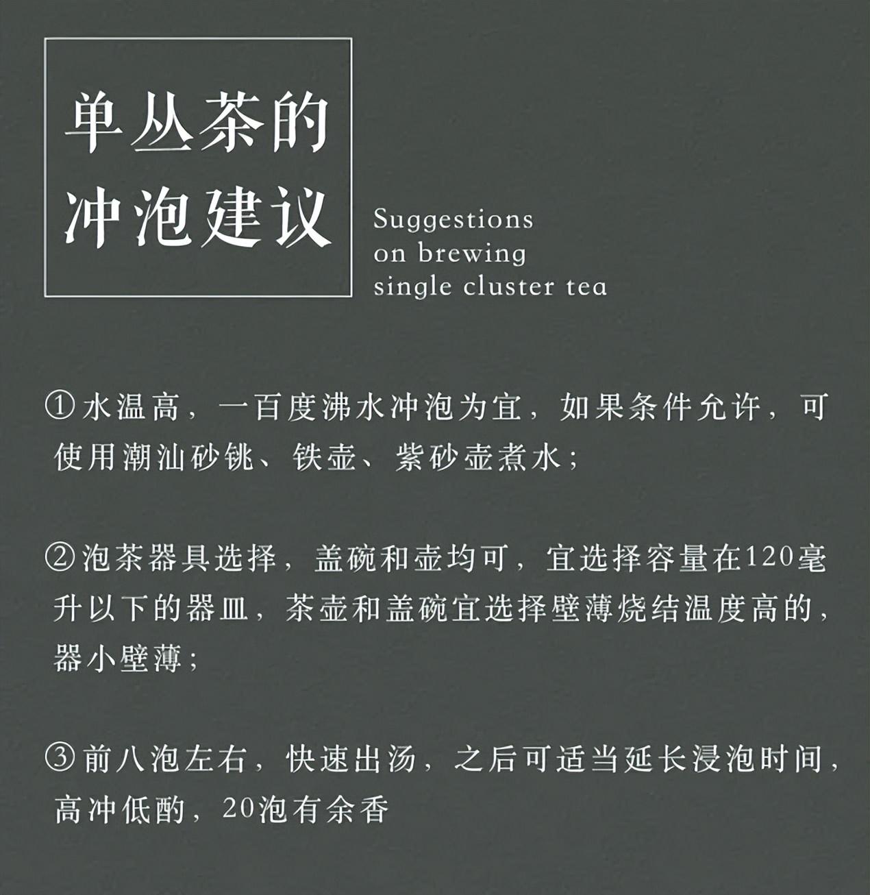 多種香氣的混合讓銀花香單叢別具一格,其滋味濃醇,回甘悠長,乃至能達到“十泡有餘香”,被譽爲“茶中香水”。而“鴨屎香”與它“茶中香水”的美譽形成的巨大反差,則給它增添了不少趣味。