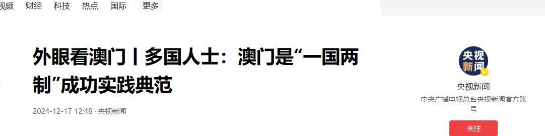 參考信源:《多國人士:澳門是“一國兩制”成功實踐典範》2024-12-17 16:30·中國青年網
