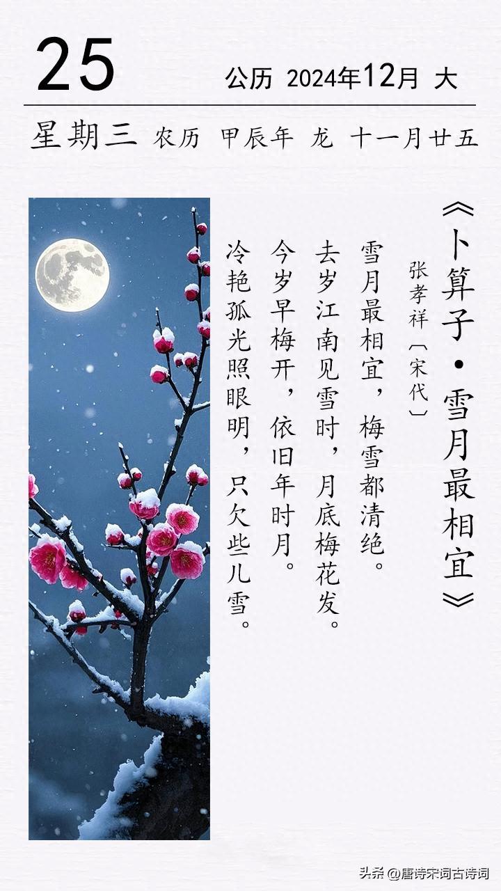 雪與明月,相互映襯,相得益彰;梅開雪中,清冷高潔,超凡脫俗。去年在江南見到雪景時,梅花是在月底綻放。