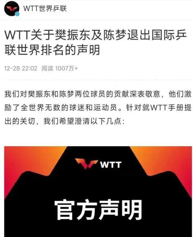 對於樊振東與陳夢二人來說退出國際排名的原因是非常簡單的,因爲難以接受WTT不參賽就罰款的霸王性質的條約。