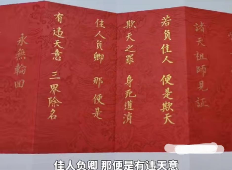 在婚書之中寫到如果丈夫辜負了妻子的真心,那麼他將受到天地的懲罰,肉身消失,道力消失。