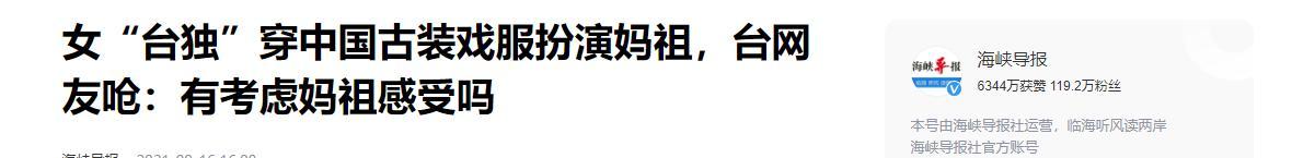 參考信源:《女“臺獨”穿中國古裝戲服扮演媽祖,臺網友嗆:有考慮媽祖感受嗎》海峽導報 2021-09-16 16:08