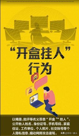 但“開盒掛人”則升了一級,其目地就是以侵犯他人爲目標。這種明目張膽的違法行爲,必須嚴厲打擊,否則社會秩序豈不亂了套。