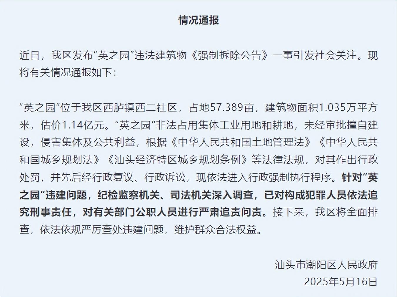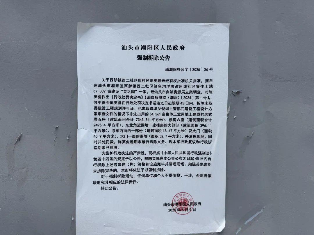 而當我們追溯圍繞着這座英之園的相關糾紛時不難發現,其實早在2020年,汕頭市自然資源局潮陽分局就已經發布通告要對英之園這一違法建築物進行沒收處理了。