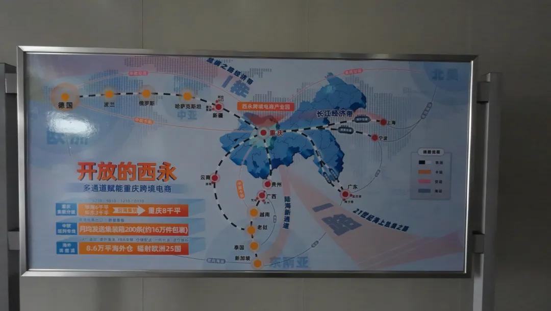 倉庫的大門入口,擺放有一張地圖,地圖上,多條線路貫穿重慶這個中心點,形成了一張網狀圖。