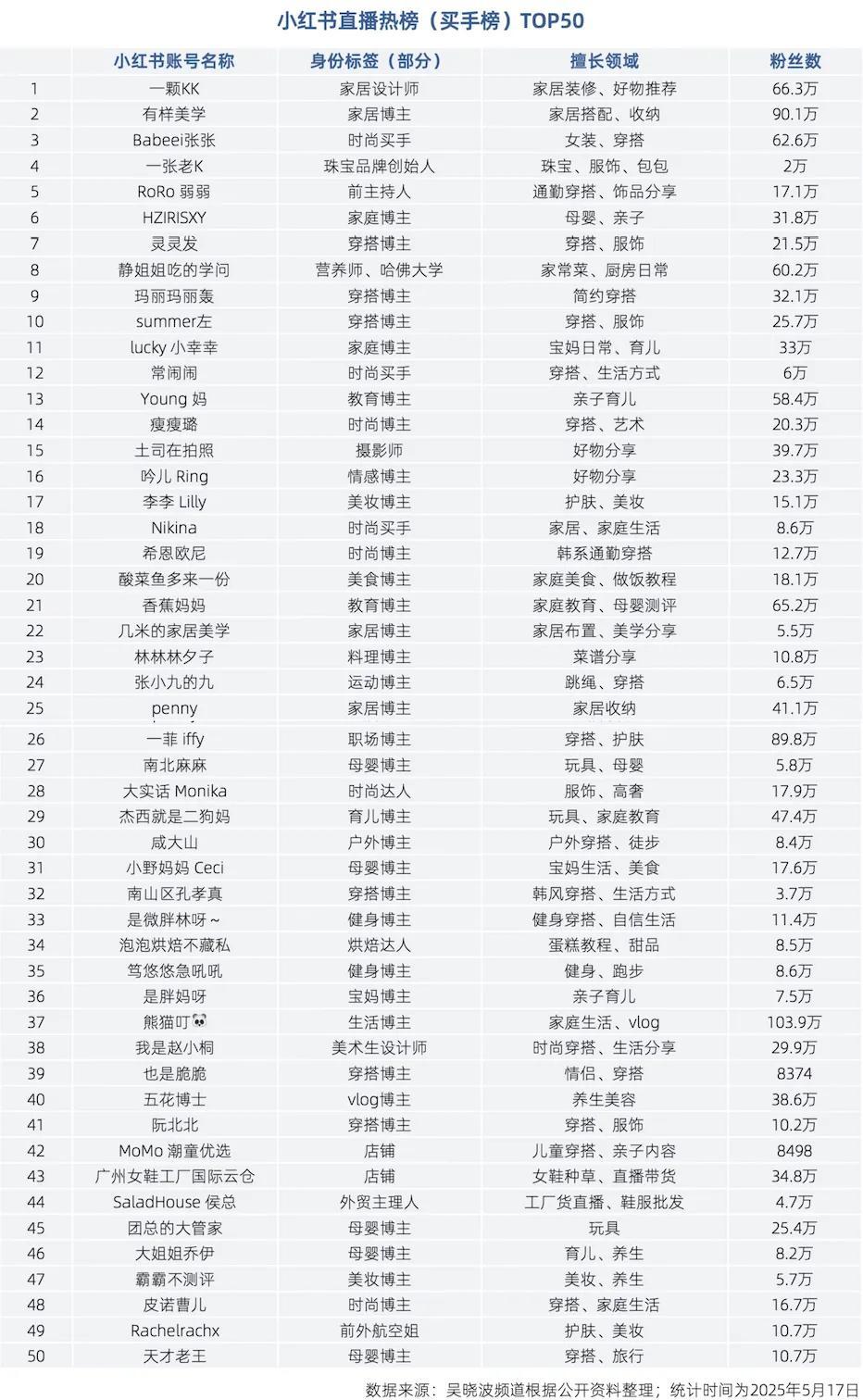 根據小紅書直播買手榜熱榜TOP50數據,家居與穿搭類博主佔比超4成,育兒、美妝、美食等細分領域緊隨其後,這些賬號粉絲量集中在10萬—60萬區間。部分賬號的“專業人設”也較爲突出,如家居設計師、營養師等。