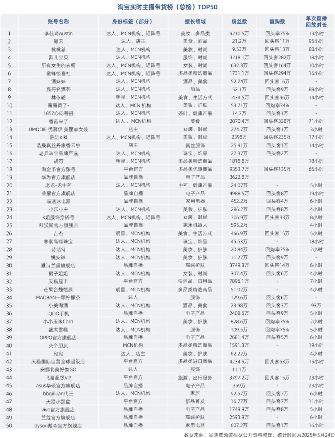 另一大重要力量則是自播的“品牌”。在淘寶實時主播帶貨總榜TOP50賬號中,接近三分之一是品牌和平臺官方賬號,分佈於快消品、3C數碼、家用電器、美妝個護等賽道。這些賬號的粉絲數普遍超千萬,開播時間多集中在4—6小時。
