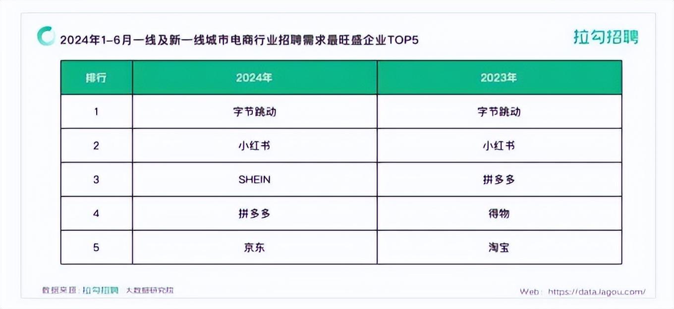 高增長的背後自然需要人才的注入。拉勾招聘數據顯示,2024年,字節跳動、小紅書等頭部平臺在一線及新一線城市的電商招聘需求居高不下。內容平臺、短視頻平臺、MCN機構是主要招聘方。