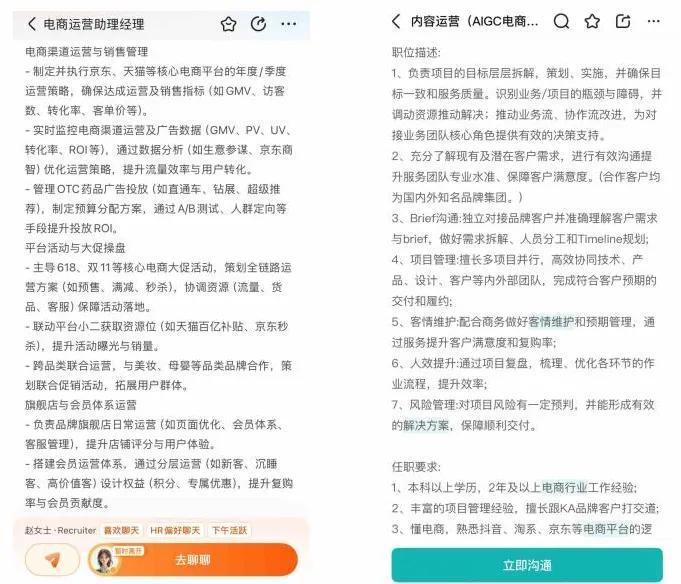 更重要的,是“一個運營頂十個主播”已成爲不少品牌主和MCN機構的共識。在招聘平臺搜索“電商”關鍵詞,可以發現大量職位要求具備剪輯、選品、投流、腳本創作、數據分析等多項技能。