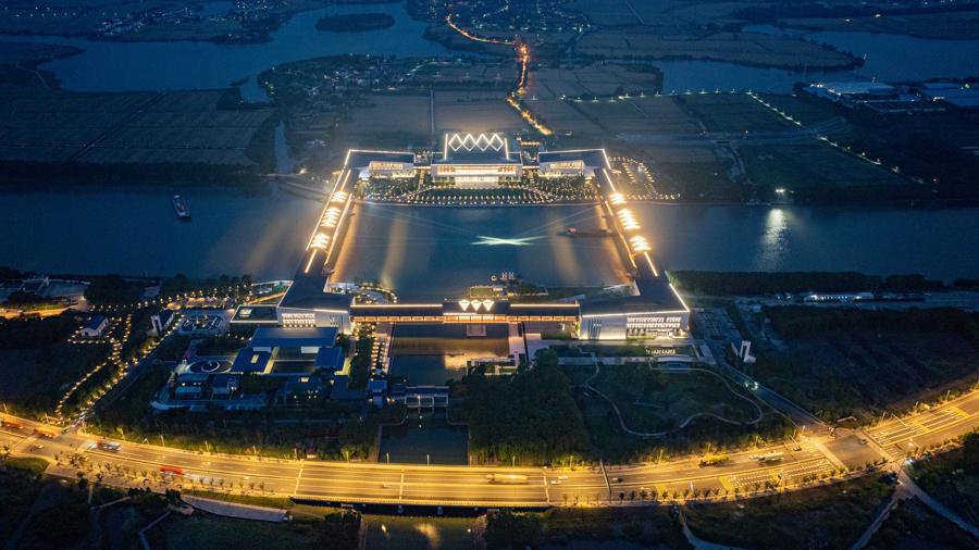 “左腳上海、右腳江蘇,左前方浙江館、右前方安徽館,正前方主會館。”5月28日,記者走進長三角生態綠色一體化發展示範區重大功能性項目——方廳水院,15分鐘跑遍長三角。