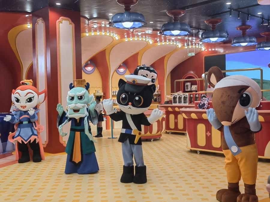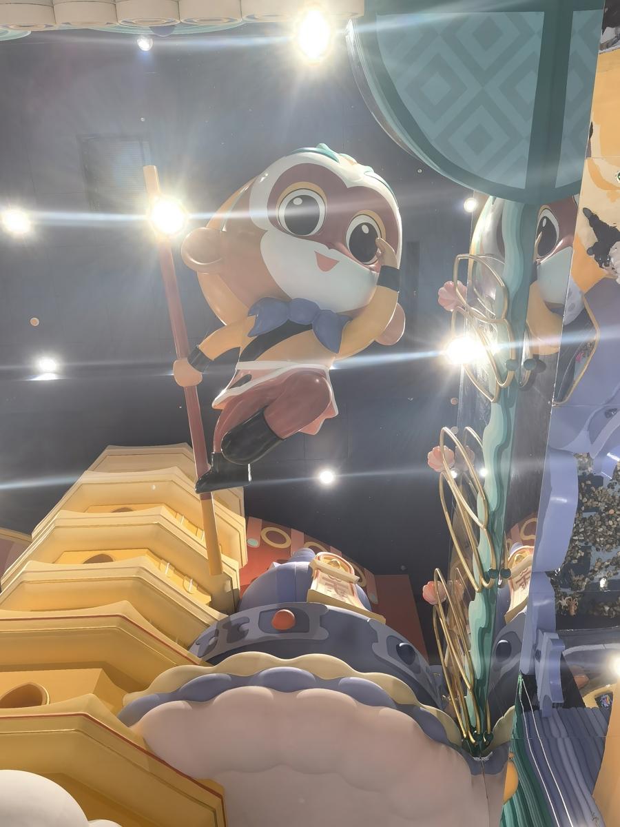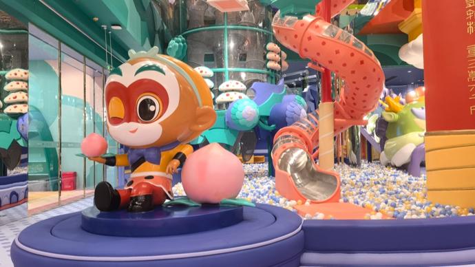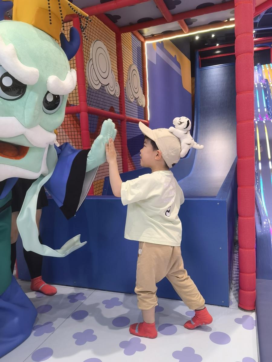 樂園將中國文化展現得淋漓盡致。藍色系的海底龍宮、綠色系的花果山、紅黃配色的天宮由下到上依次展開。“我們花了兩年多時間復刻動畫中的場景,從《大鬧天宮》的中國畫意境中提取色彩,用現代卡通語言重新詮釋,讓小朋友看到‘全世界最厲害的動畫片’該有的樣子。”泡泡米創始人、上海影米文化總經理胡佳靜說,孩子們在遊玩過程中,不僅能收穫快樂,還能潛移默化地接受中國動畫美學和傳統文化的薰陶。“希望通過這樣的設計,讓這些經典IP以全新的形式走進孩子們的生活。同時,也爲家長和孩子提供一個高質量的親子互動空間,創造更多美好的回憶。”