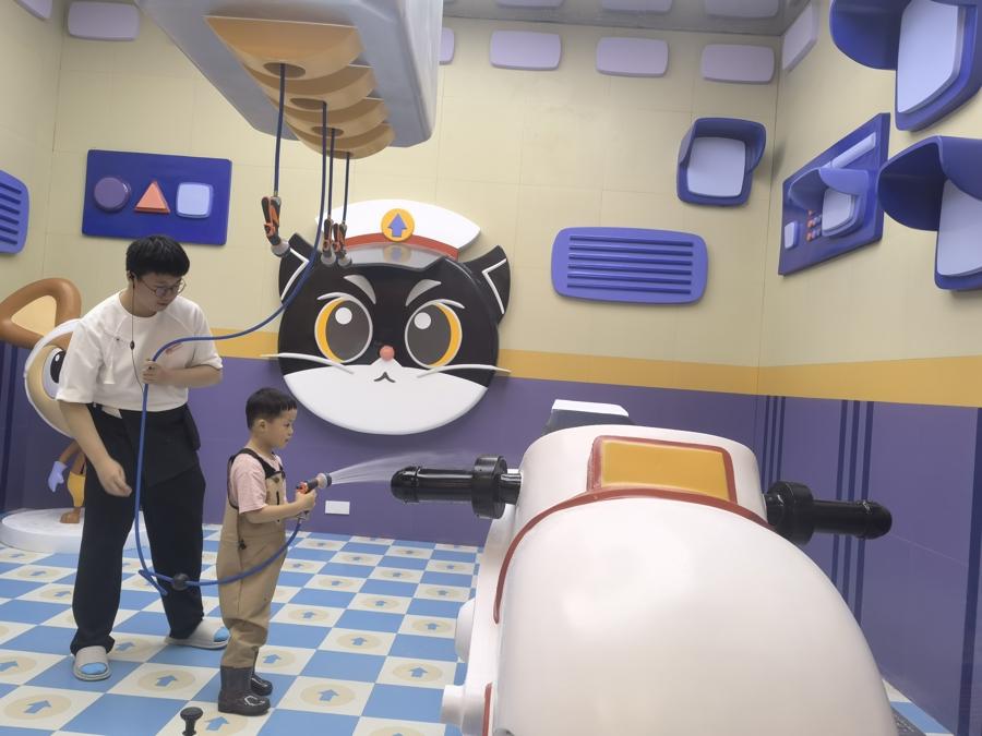 如今,親子家庭對於兒童遊樂場所的要求不再僅僅侷限於娛樂,更注重文化內涵和教育意義。樂園的細節處處體現出提升兒童體驗感的巧思:模仿《種金子》這一集的情節,孩子們在遊戲中幫助阿凡提智鬥巴依老爺;設置哪吒與龍王從“對抗”到“共治環境”的轉變,讓孩子們在遊玩中理解環保與共生……“不僅要展示IP形象,更要傳遞動畫中的價值觀。”上影元空間事業部副總經理周爍說。“葫蘆兄弟”主題的餐廳周圍,二娃的“千里眼”萬花鏡、七娃的“寶葫蘆”轉轉樂等互動裝置,讓用餐區也變成了充滿童趣的遊戲場。“我們拒絕簡單的IP陳列,”他強調,“每個項目都深挖動畫劇情,讓孩子在動手過程中重溫故事邏輯,這纔是‘活’的IP體驗。”