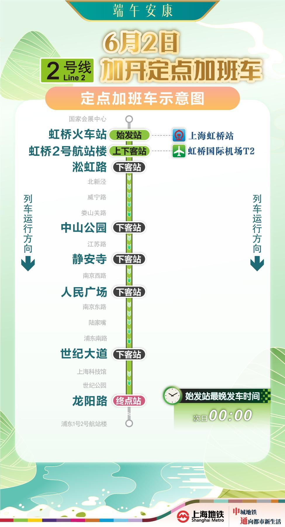 2號線虹橋火車站站往龍陽路站方向加班車,沿途停靠虹橋火車站站、虹橋2號航站樓站、淞虹路站、中山公園站、靜安寺站、人民廣場站、世紀大道站、龍陽路站(終到站),其餘車站不停靠。停靠車站中,虹橋火車站站(始發站),虹橋2號航站樓站辦理上下客,其餘車站只下不上,途經換乘站不辦理換乘。