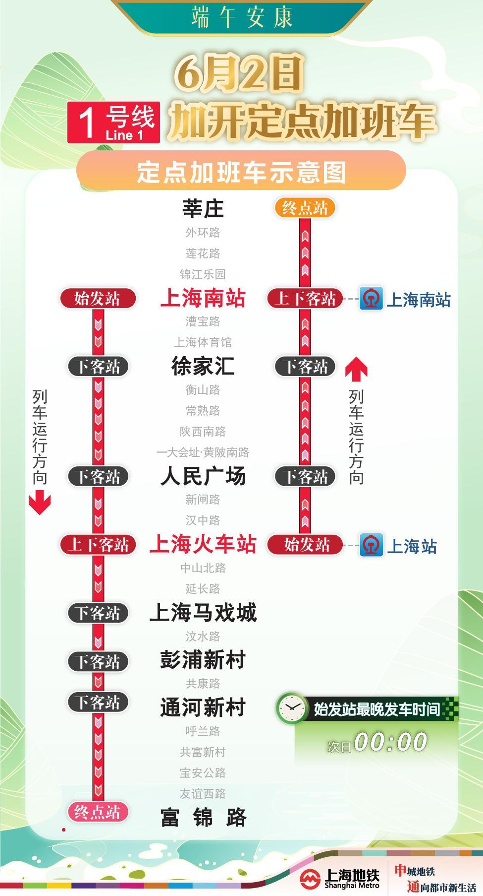 1號線上海南站站往富錦路站方向加班車,沿途僅停靠上海南站站、徐家彙站、人民廣場站、上海火車站站、上海馬戲城站、彭浦新村站、通河新村站、富錦路站(終到站),其餘車站不停靠。停靠車站中,上海南站站(始發站)、上海火車站站辦理上下客,其餘車站只下不上,途經換乘站不辦理換乘。
