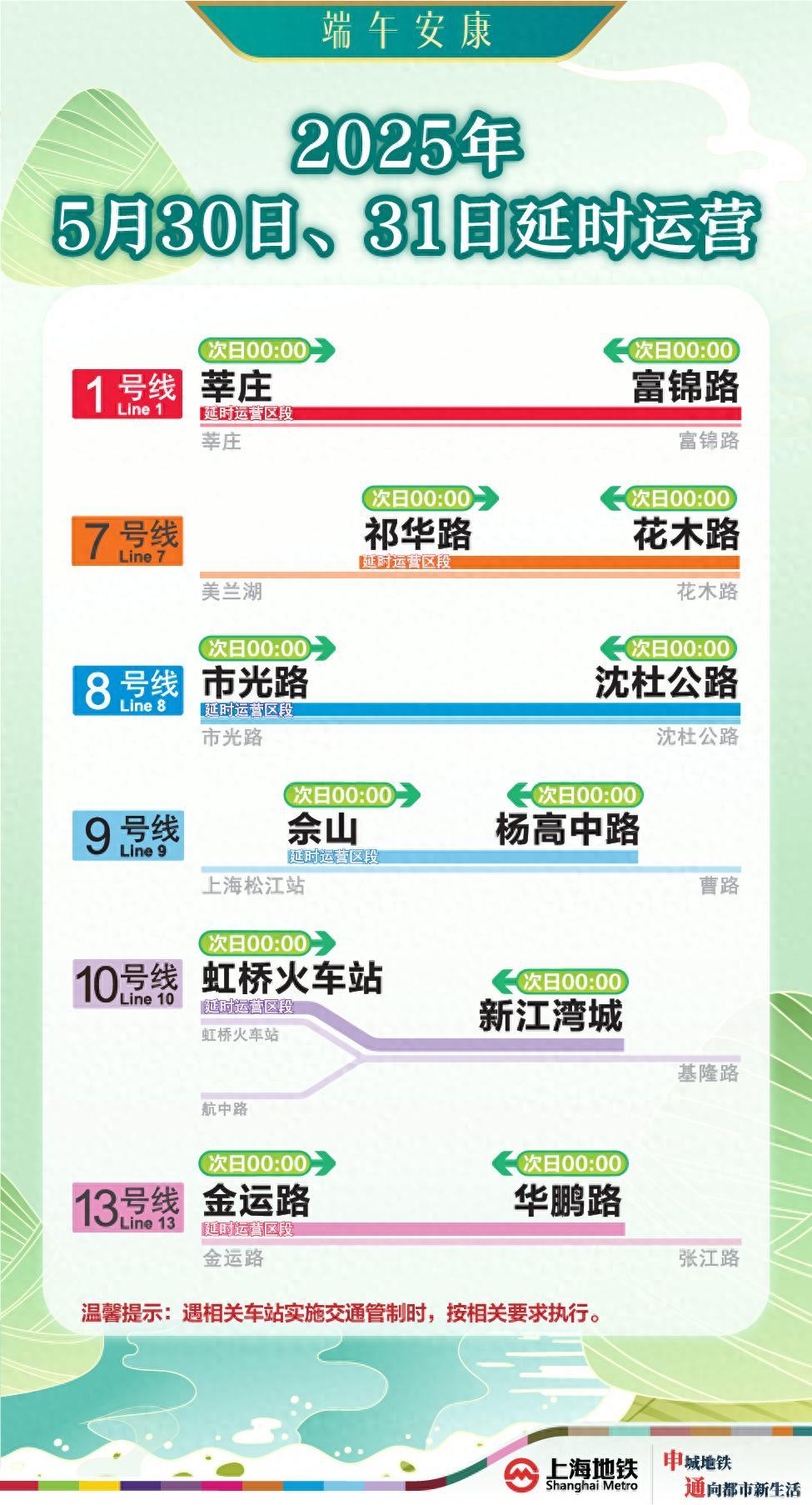 5月30日、31日,上海地鐵1、7、8、9、10、13號線六條線路,實施常態週五週六延時運營。