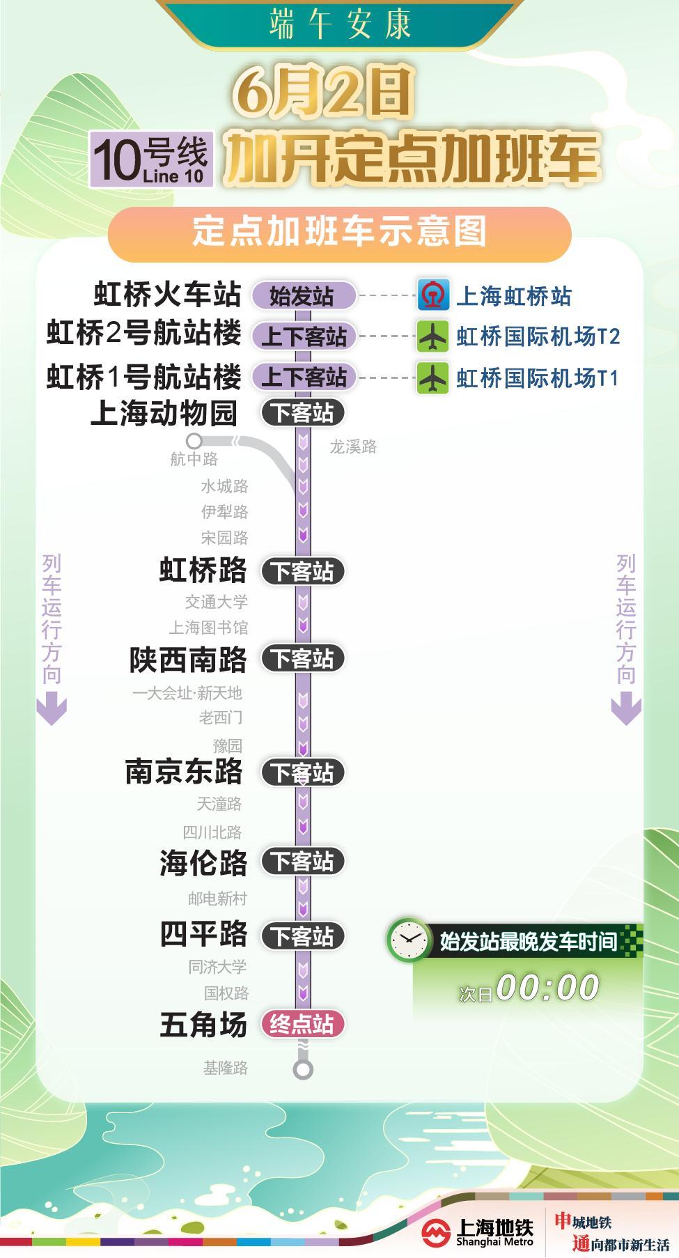 爲緩解中心城區夜高峯休閒、購物客流密集的壓力,做好虹橋火車站夜間列車集中到達大客流疏散工作,6月2日假期最後一天,1、2、10、17號線實施定點加開方案,均加開末班車延長至次日0點: