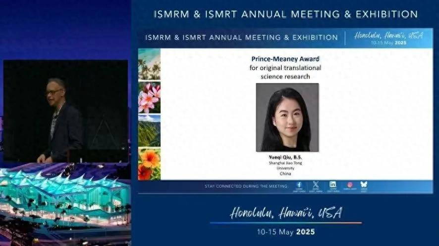 Prince-Meaney Translational Science Award是ISMRM Young Investigator Award三大獎項之一,是ISMRM頒發的磁共振基礎科學轉化研究領域最高榮譽。評選採用論文評審、大會答辯及專家組終審三重遴選機制,每年僅授予全球範圍內最具臨牀應用價值的突破性研究成果。