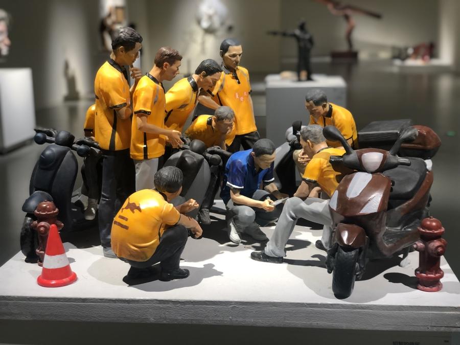 陳屹也特別提到,很多作品體現出藝術家認真的創作態度,不僅在於紮實的基本功,也在於對於現實生活的觀照。例如,周祺的《短暫的停留》定格的是頗爲生活化的一幕場景,只見一羣快遞小哥忙中偷閒,圍着其中一位手裏拿着的手機,津津有味地看着足球賽。樂樂《watcher》是一件超寫實的猩猩雕塑,精準地捕捉到動物的造型以及內在表達。